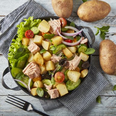 Ensalada de papa con pepino, atún, jitomates cherry y aceitunas negras