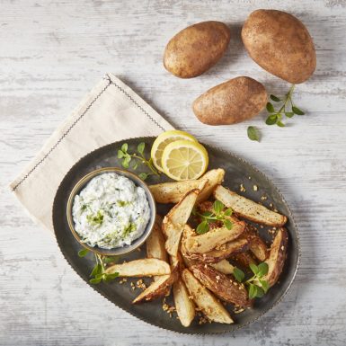 Sirva las papas con el tzatziki y decore con algunas hojas de orégano fresco.